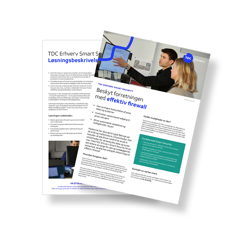 En cyberforsikring træder til, hvis uheldet er ude. Men det bedste er, hvis angrebet slet ikke lykkes. TDC Erhverv Smart Security er effektiv beskyttelse uden bøvl og besvær. Løsningen vedligeholdes og opdateres af TDC Erhverv, og den sikrer både enheder og brugere på kontoret samt medarbejdere på hjemmearbejdspladsen.