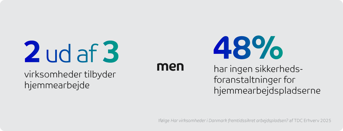 Ifølge TDC Erhvervs rapport Har virksomheder i Danmark fremtidssikret arbejdspladsen? tilbyder 2 ud af 3 virksomheder i Danmark medarbejderne at arbejde hjemmefra mindst én dag om ugen. Kun 7 % forventer at reducere hjemmearbejde fremover – og blot 1 % planlægger fuldt fysisk fremmøde.