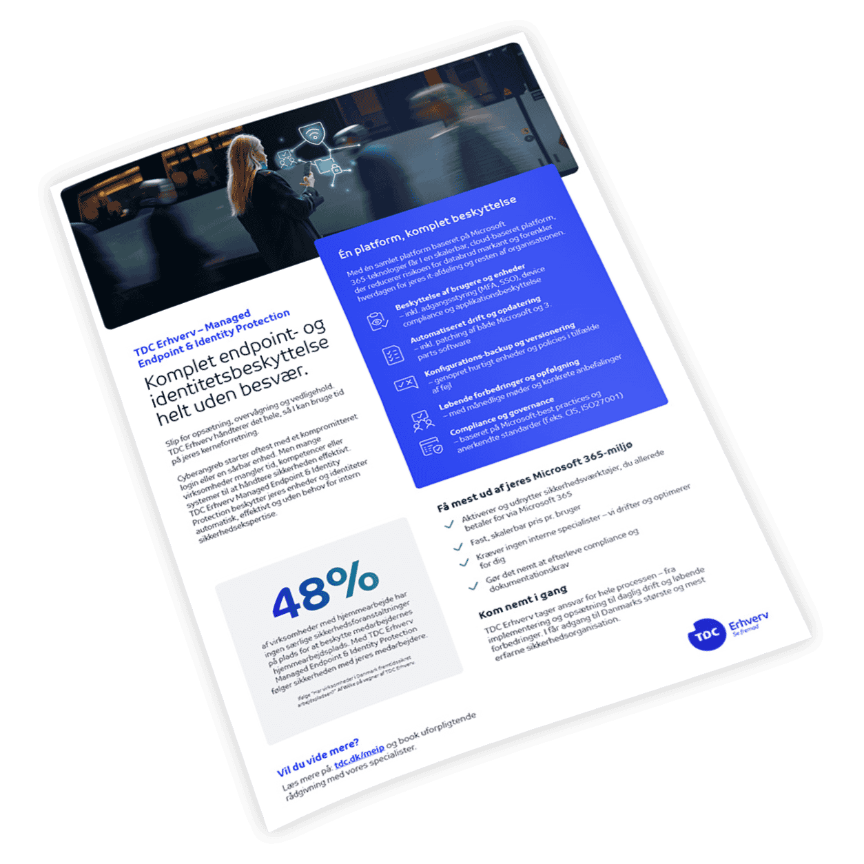 Med hybridarbejde som den nye normal bliver arbejdspladsens perimeter sløret. Uden faste kontorpladser og fire vægge bliver sikkerheden nødt til at følge medarbejderne – ikke kontoret. For når medarbejdere arbejder hjemmefra, ofte på tværs af netværk, lokationer og enheder, er det nemmere at miste overblik og kontrol. Med Managed Endpoint & Identity Protection kan I trygt slippe kontrol – vi står klar til at gribe den og sørge for overblikket.