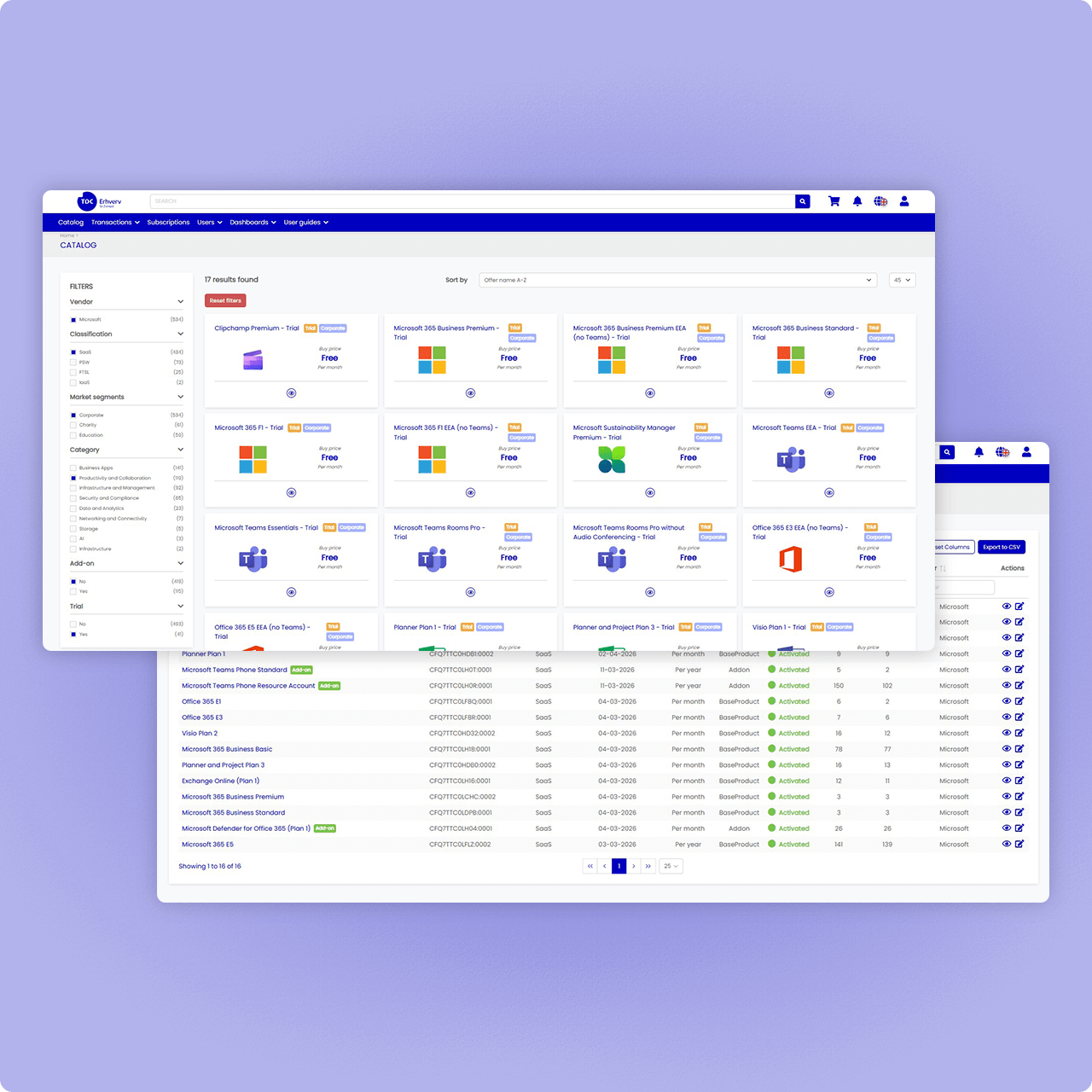 Siden med abonnementer giver et intuitivt overblik over de nuværende abonnementer med licensantal, og det er entydigt hvor man kan regulere på abonnementerne. I kataloget er det nemt at sortere i segmenter og kategorier, når den nye software skal identificeres og bestilles.